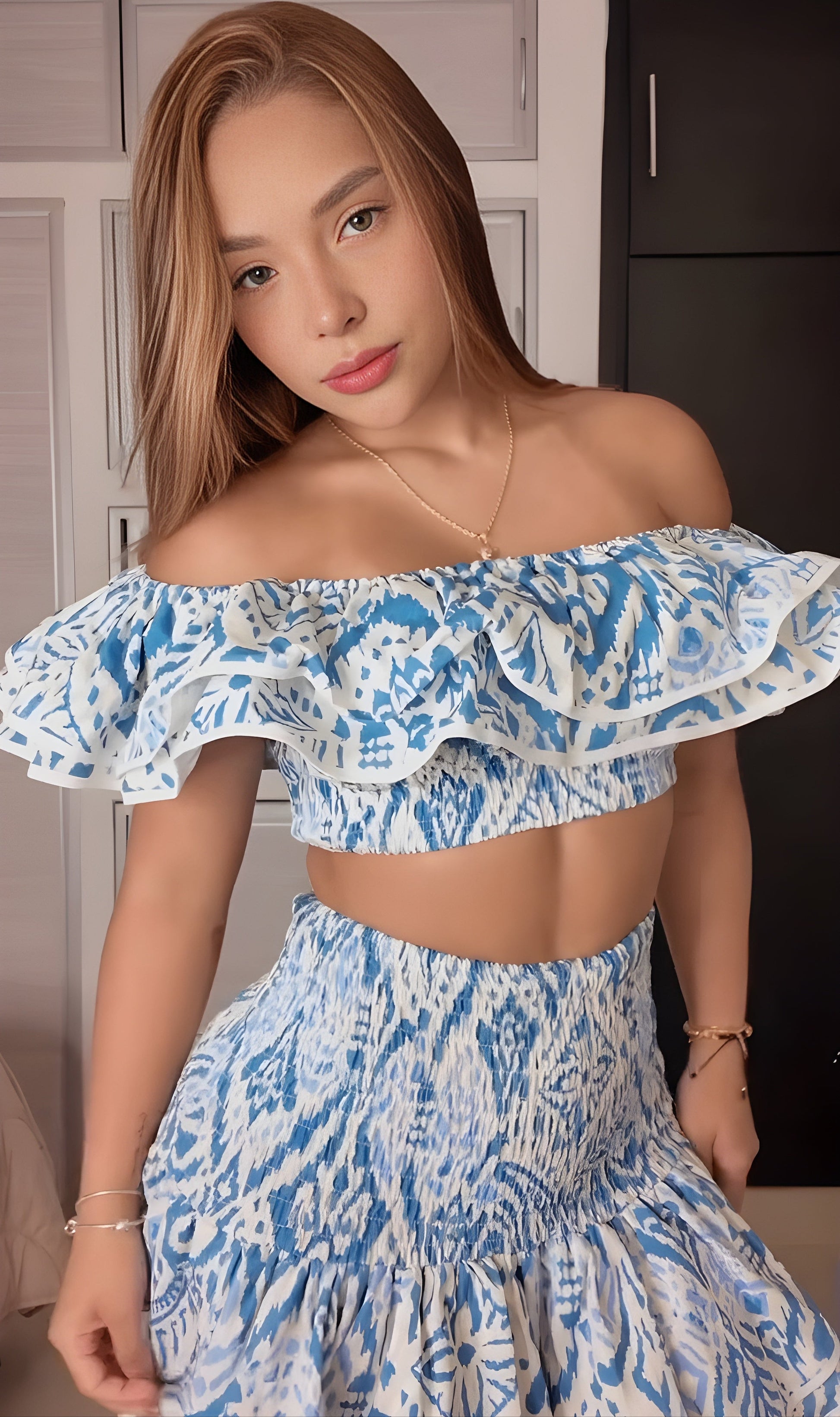 Conjunto leve, style et super feminino, composto por top cropped ciganinha com babado volumoso e saia longa de cintura alta com detalhe in lastex .