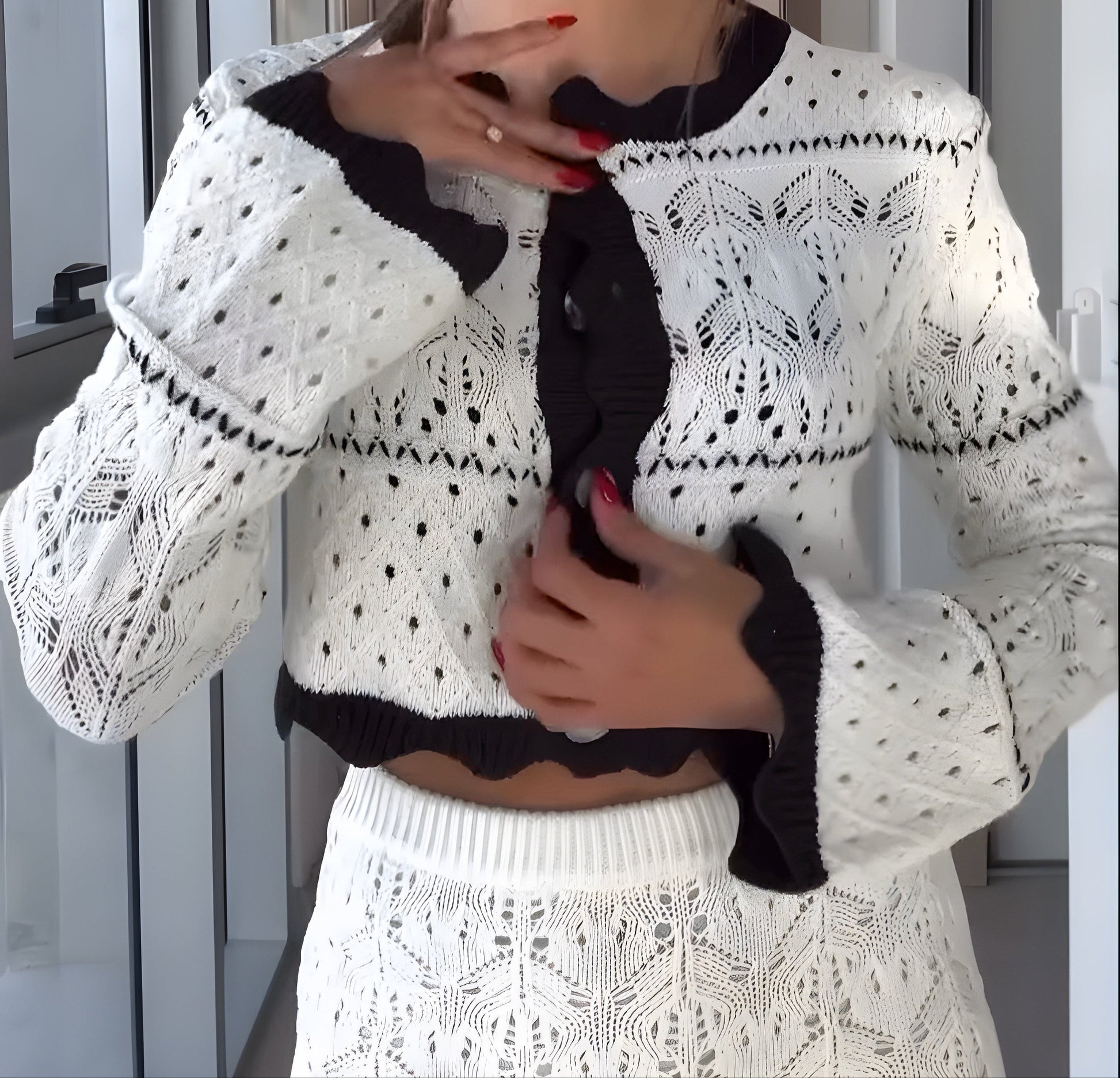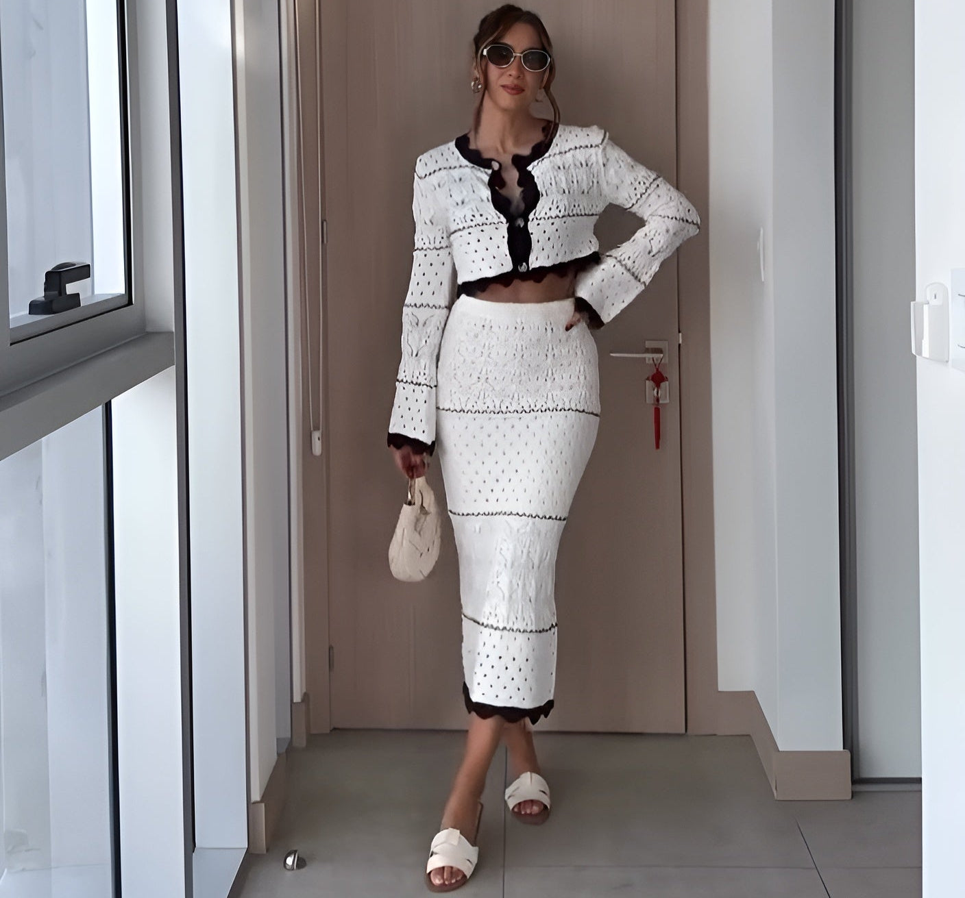 Conjunto élégant et sophistiqué confectionné en tricot travaillé , composé de manches courtes avec des bottes frontales et saia midi ajustées , avec des détails délicats en tout contrastant qui valorisent le design de la pièce.