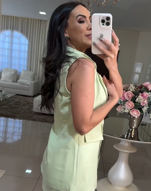 Fresque et sophistication dans un look moderne ! Conjunto em tom green claro with colete longado de gola blazer and botão dourado, combiné avec short de cintura alta et bolsos frontais. Idéal pour les productions élégantes de nos jours, avec un style élevé et contemporain.