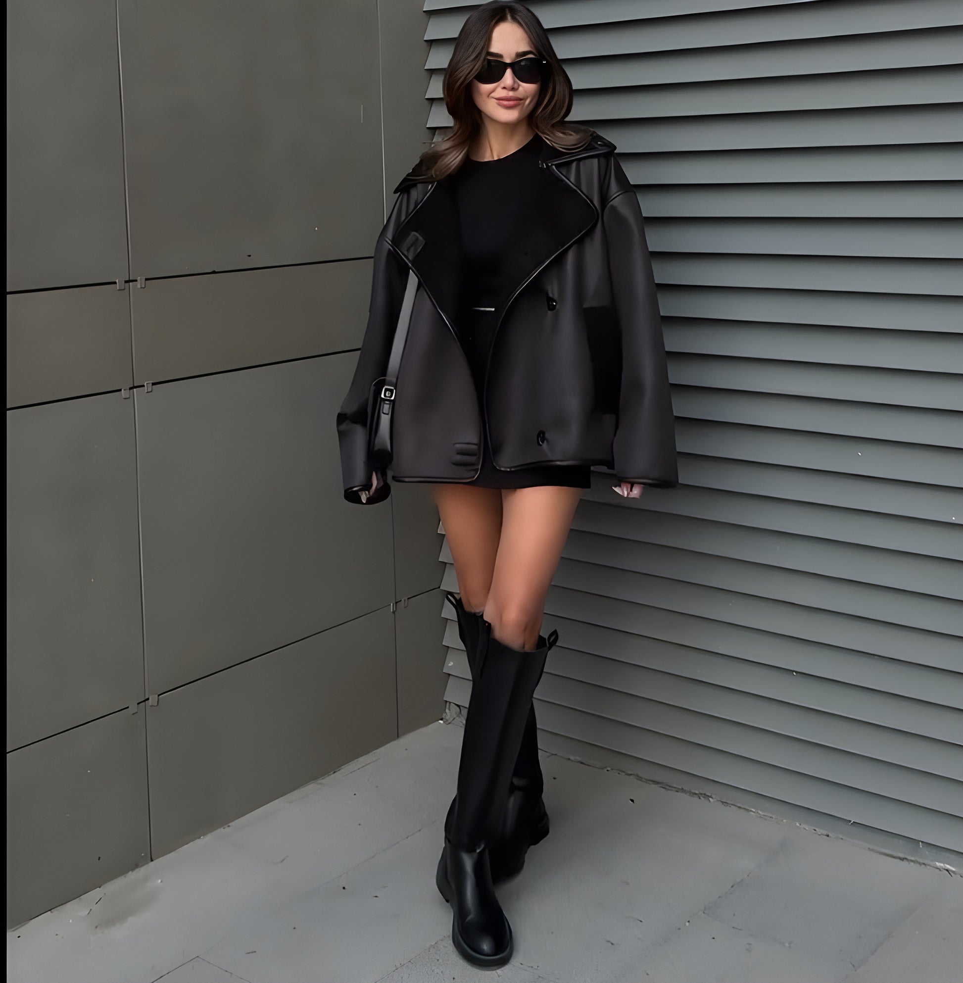Veste noire oversize en cuir synthétique avec doublure douce façon mouton retourné. Son col large et sa coupe structurée offrent une allure parisienne audacieuse et contemporaine. Idéale pour les journées fraîches, associée à une mini-jupe et des bottes hautes pour un look urbain chic et sophistiqué.